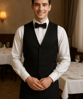 A hotel restaurant/banquet uniform is a formal, coordinated attire designed for waiters, servers, and banquet staff to present a professional and elegant image during F&B service or events. Usually crafted from poly-cotton or polyester blends for durability, comfort, and stain-resistance, these uniforms enhance hotel branding, guest recognition, and hygiene. Common